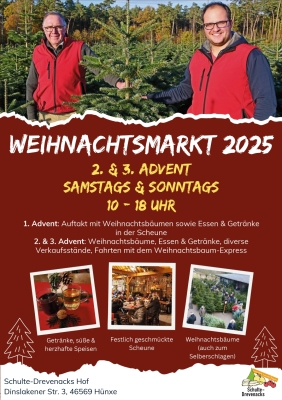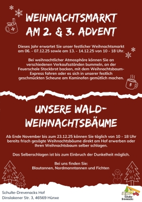 Jeweils am 2. & 3. Adventswochenende wird das beliebte Selber-Schlagen der Weihnachtsbäume mit Bollerwagen oder bequem mit dem Weihnachtsbaum-Express stattfinden. Begleitet von einem großen Weihnachtsmarkt an den beiden Wochenenden.