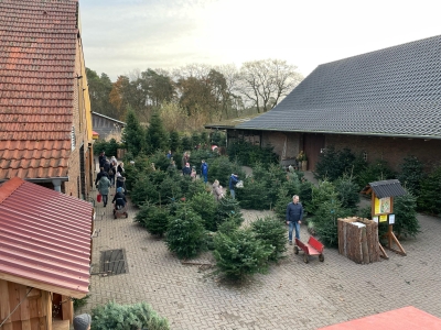 Für das Wetter sind wir nicht zuständig, aber gegen Nässe und Kälte gibt es warme Kleidung und danach wartet unsere schöne beheizte Scheune auf Euch mit warmen Getränken oder direkt hinten an der großen Halle wenn ihr von den Weihnachtsbäumen kommt